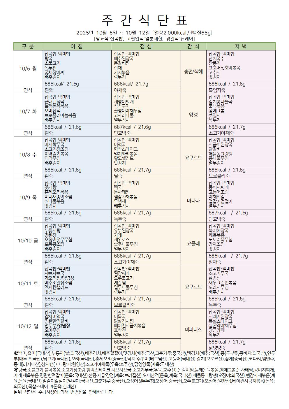 사랑과 정성을 담은 첼로병원 주간식단표입니다.