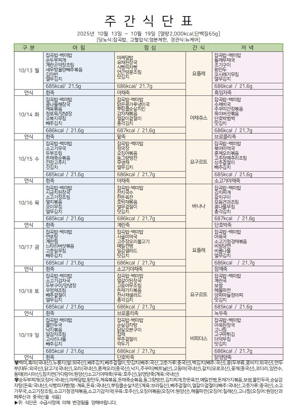 2025.10.13~2025.10.19 식단표